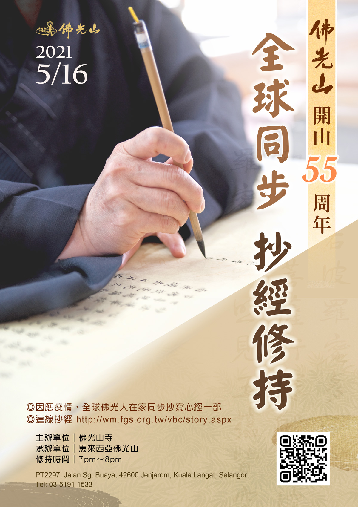修持日期:2020年5月16日(星期日) 修持時間: 7pm~8pm 地點:佛光山東禪寺 進行方式:同步連線抄經